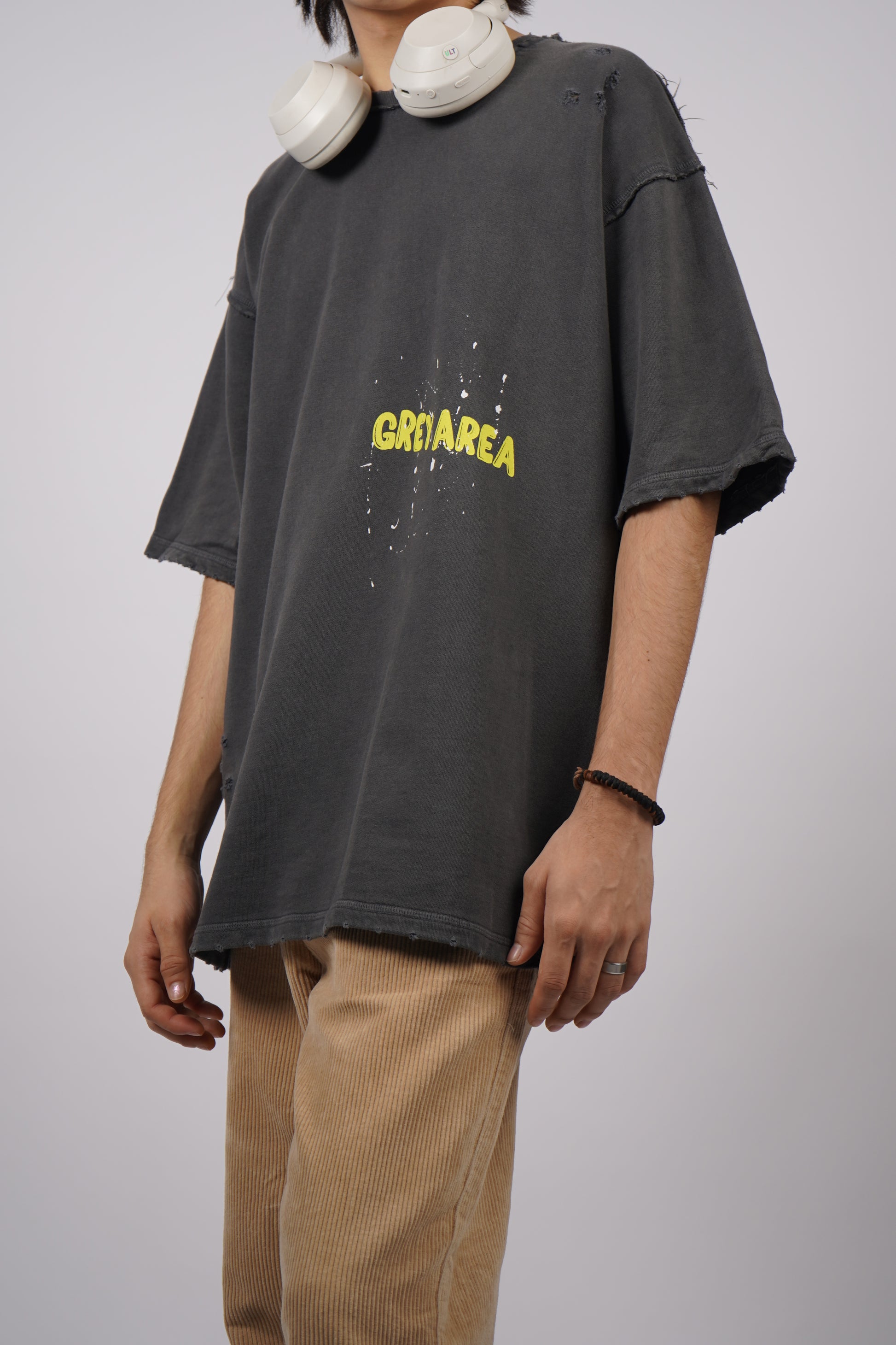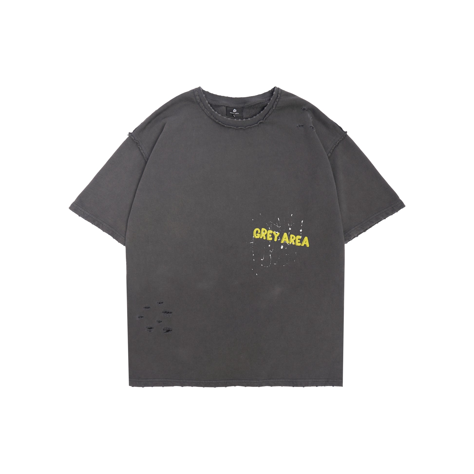 This T-shirt has a raw vintage vibe with ripped texture on front and back. The neck and sleeves have a unique reverse stitch giving character to the t-shirt.